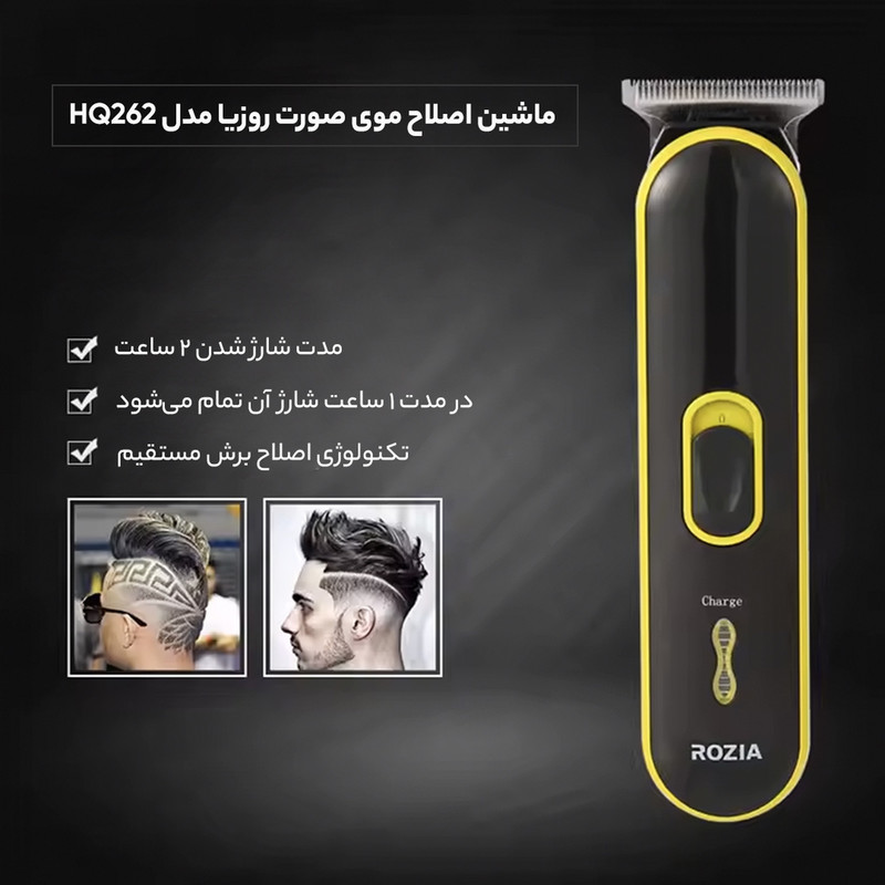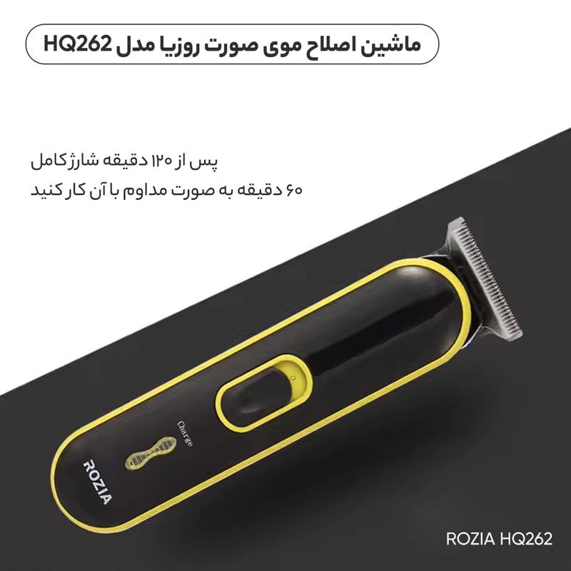 ماشین اصلاح مدل HQ262 ساخت شرکت روزیا و کشور چین است. جنس تیغه های این ماشین اصلاح از تیتانیوم ساخته شده است که در مقابل هوا و رطوبت از مقاومت خیلی بالایی برخوردار است. تکنولوژی برش این ماشین اصلاح به صورت مستقیم می باشد. سری اصلی این ماشین اصلاح موهای سر و صورت را از 0.1 تا 2 میلی متر اصلاح می کند. همچنین برای اصلاح موهای بلندتر می توان از 4 تا شانه ای که به همراه آن ارایه شده است استفاده کرد. با استفاده از این شانه ها می توان موهای سر وصورت را از 3 تا 12 میلی متر اصلاح کرد. باتری ماشین اصلاح روزیا مدل HQ262 در مدت 6 ساعت بطور کامل شارژ می شود بعد از شارژ کامل ماشین اصلاح می توان از آن به مدت 45 دقیقه استفاده کرد. یکی از ویژگی های قابل مشاهده در این دستگاه امکان شارژ سریع است که در مدت 5 دقیقه امکان یک اصلاح عالی را برای شما فراهم می کند. به همراه این ریش تراش یک عدد برس و روغن ارایه شده است که شما می توانید بعد از اصلاح تیغه ها را به خوبی تمیز و روغن کاری کرد.