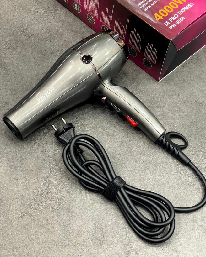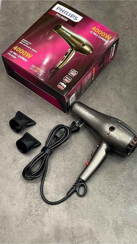 توان موتور سشوارهای خانگی عموماً زیر 2000وات و توان موتور سشوارهای حرفهای بالای 2000وات است. شرکت فیلیپس اقدام به تولید سشوار حرفهای با موتور AC و توان بالای 3500 وات کرده است. سشوار حرفه ای philips مدل ph9550 علاوه بر قدرت موتور بالا دارای فناوری تولید یون، دکمهی باد سرد و دو متمرکزکنندهی هوا است که نیازهای شخص را برای استفادهی حرفهای برآورده میکنند. برای خشککردن و حالت دادن به موها که به آن براشینگ میگویند احتیاج به سرعت و حرارت مناسب است. هرچقدر قدرت موتور سشوار بیشتر باشد در مدتزمان کمتری میتوان براشینگ را انجام داد. توان 4000 واتی موتور سشوار ph 9550 از این جهت کاملاً مناسب است. دو متمرکز کنندهی هوایی که همراه سشوار عرضه شده را میتوان با توجه به نیاز استفاده کرد. عرض این متمرکز کنندهها 60، 75 و میلیمتر است. سیم مدلهای حرفهای را عموماً بلند میگیرند تا در هنگام استفاده مشکلی بابت کوتاه بودن سیم وجود نداشته باشد. سیم این مدل هم2.2متر طول دارد و در محل اتصال به بدنه دارای حلقهای است که به کمک آن میتوان دستگاه را آویزان کرد. اکثر سشوارها یک حالت باد سرد دارند که در حالت فعال بودن آن المنت سشوار از کار میافتد و میتوان حالت یک قسمت از مو را تثبیت کرد. در این میان تعدادی از این سشوارها هستند که برای باد سرد یک دکمهی فنری در نظر میگیرند تا بتوان به شکل لحظهای با فشردن دکمه از باد سرد استفاده کرد و با رها کردن آن مجدداً باد گرم شود. سشوار 9550 فیلیپس نیز دارای این دکمه در بالای دسته است. از ویژگیهای بارز این سشوار فناوری تولید یون است. ژنراتور یونی با روشن کردن سشوار فعال شده و یونهای منفی تولید میکند. این یونها با باد سشوار خارج میشوند و پس از برخورد به موها الکتریسیته ساکن روی آنها را از بین میبرند. بهاینترتیب وز شدن مو کمتر اتفاق میافتد و حالت دادن به موها هم راحتتر میشود. برای حالت دادن و خشککردن موها میتوان سرعت و حرارت باد را روی مقدار دلخواه تنظیم کرد. برای این کار باید از دکمههای روی دسته استفاده کرد که دو حالت سرعت متوسط و زیاد و سه حالت حرارت ملایم و گرم و داغ را فراهم میکنند.